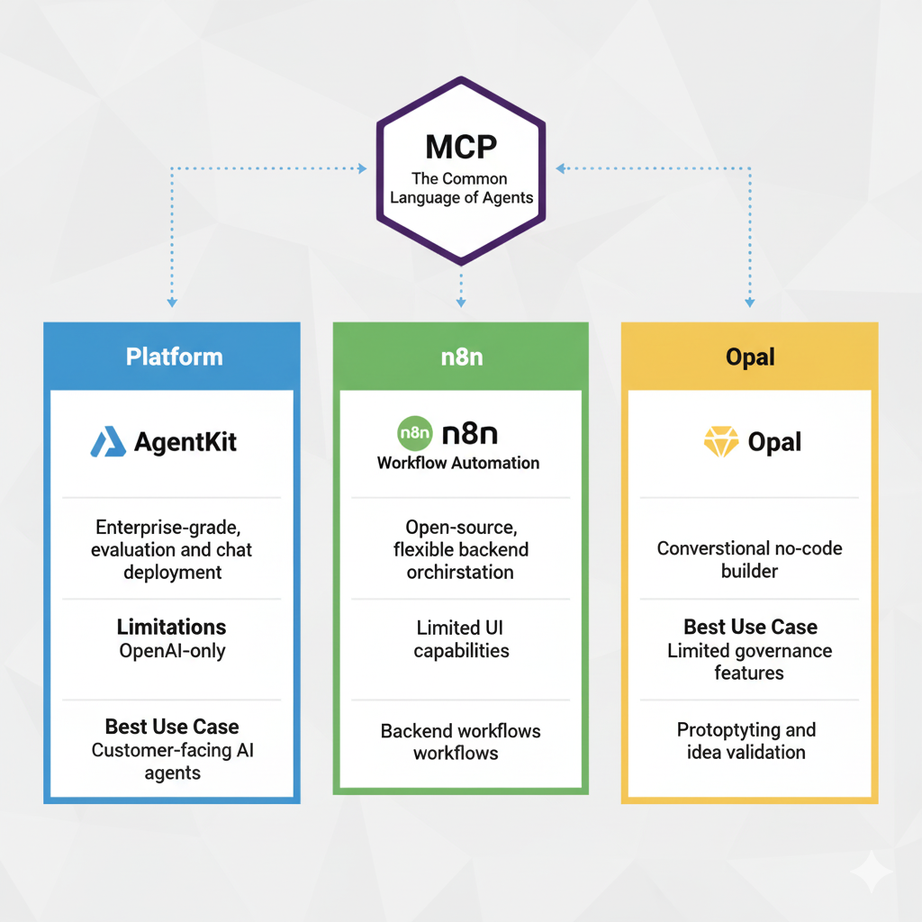 Both AgentKit and n8n support MCP, enabling seamless interoperability between front-end and backend agent systems.